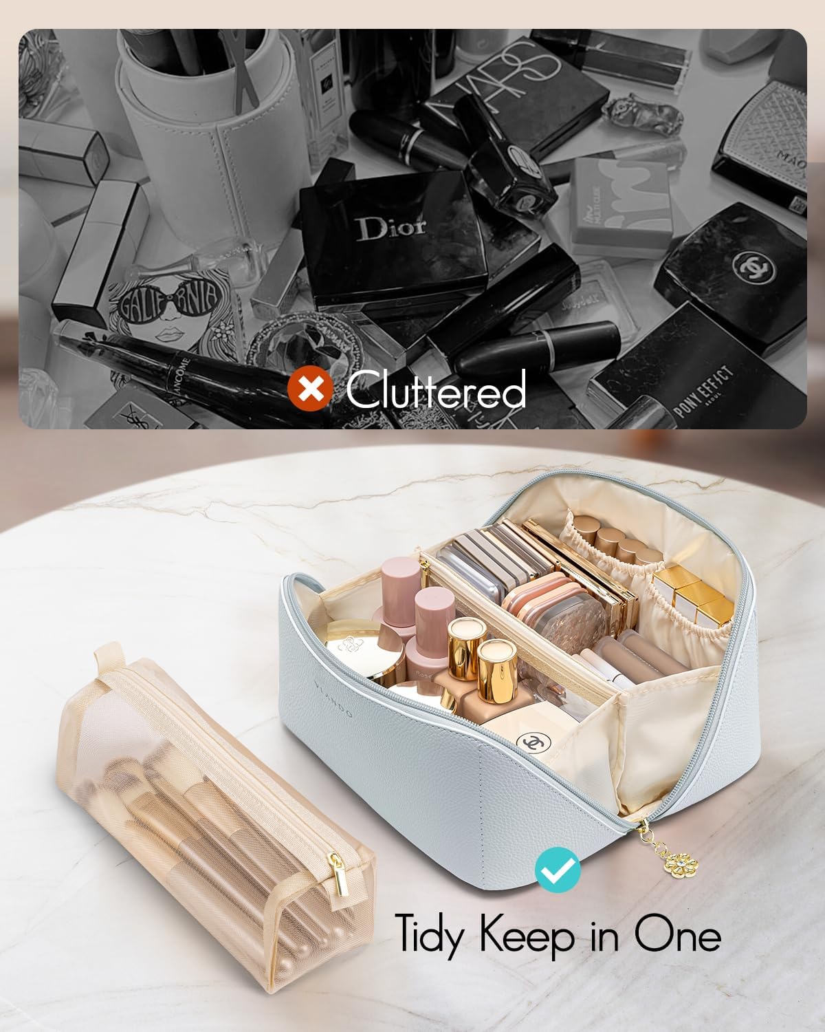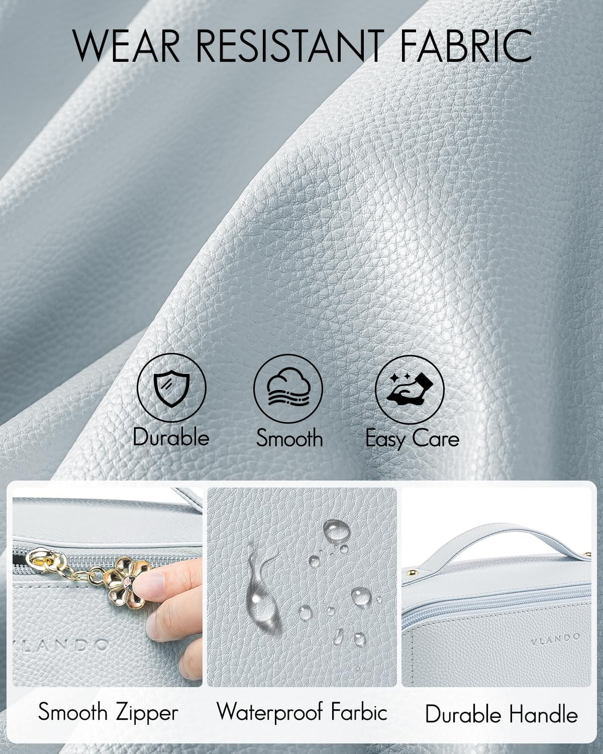 Vlando Makeup Bag,Travel Makeup Bag Waterproof Portable Cosmetic Bag PU Leather Open Flat Make up Organizer for Toiletries,Makeup Brushes Bag for Teen Girls Women(Baby Blue)