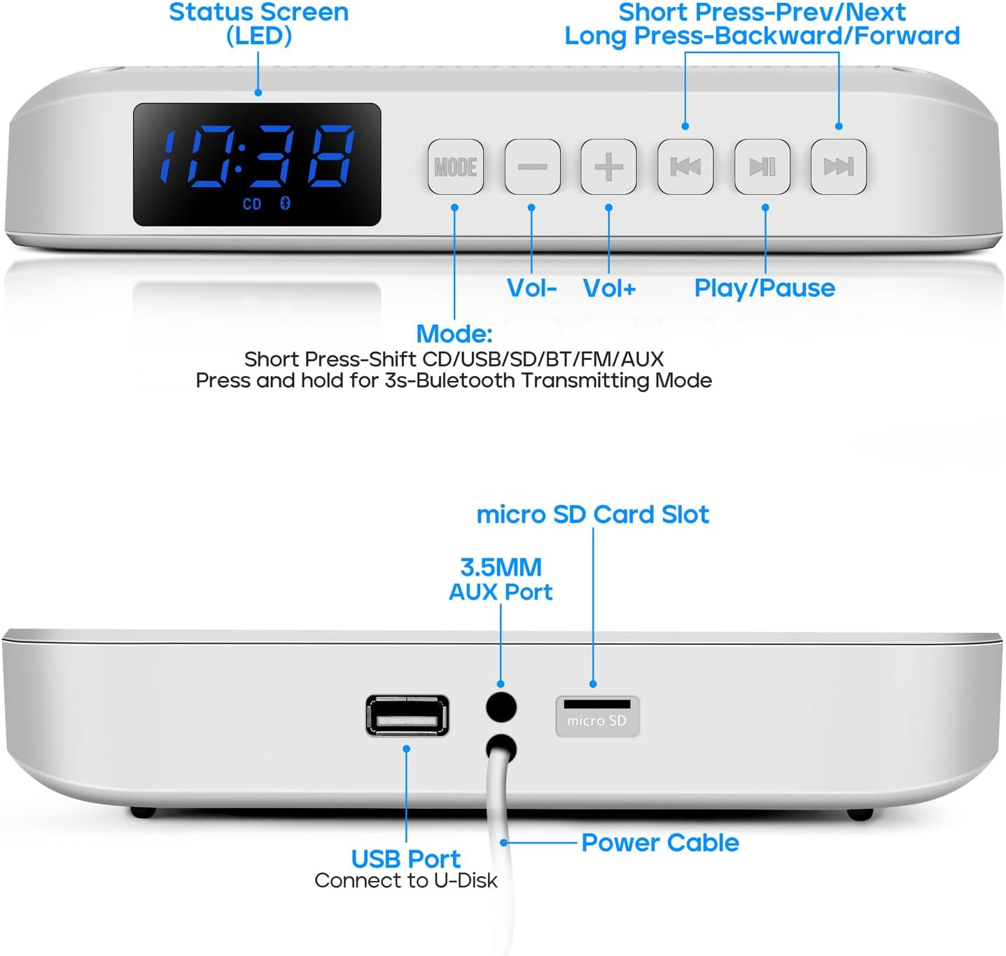 【6-in-1 Multifunction CD Player】 ROADOM wall cd player comes with 6-in-1 function including CD, Bluetooth, U disk, SD card, AUX and FM Radio. CD function is widely compatible with five audio formats including CD, CD-R, CD-RW, MP3, and WMA. Effortlessly connect this small CD player to your Bluetooth-enabled devices, such as phones, computers, and tablets. It serves as a Bluetooth speaker, and with its Bluetooth transmitter, you can enjoy your CDs wirelessly on Bluetooth earphones or speakers