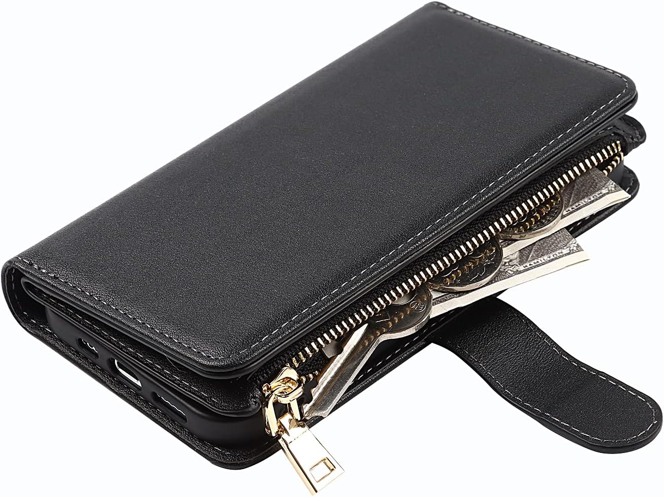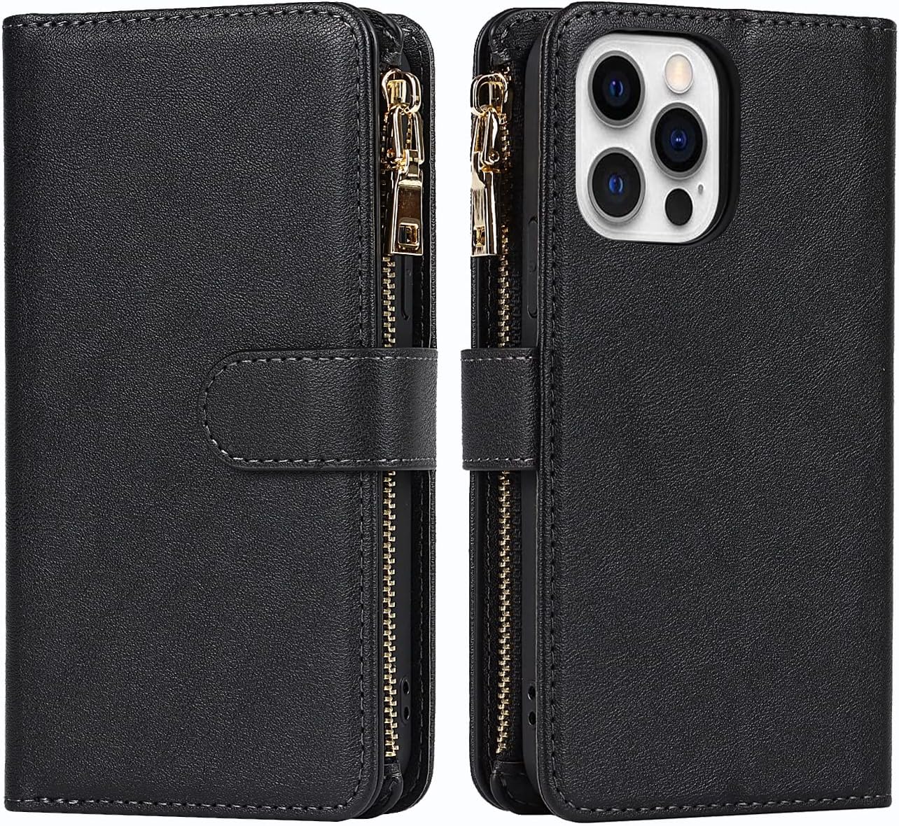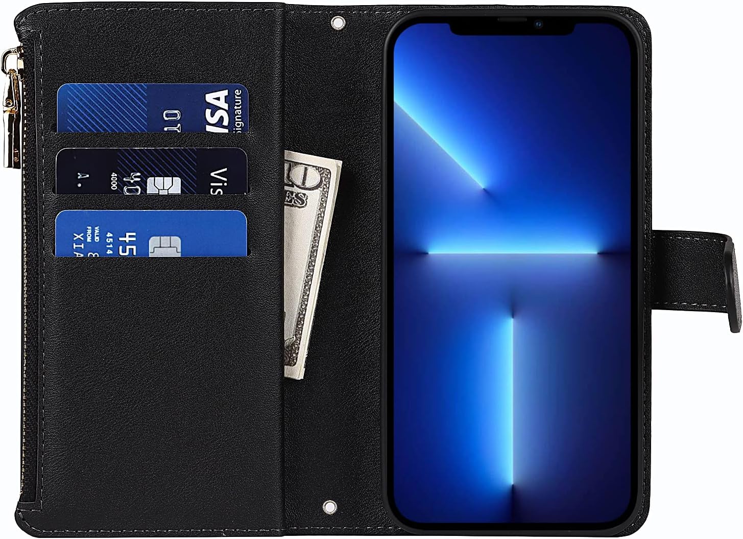 Wallet Phone Case Design for iPhone 13 Pro Max 9 Card Holder 1 Zipper Coin Wallet 2 Cash Slot Kickstand Lanyard Flip Leather Cover Black