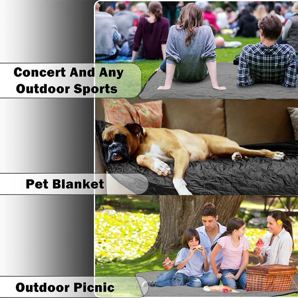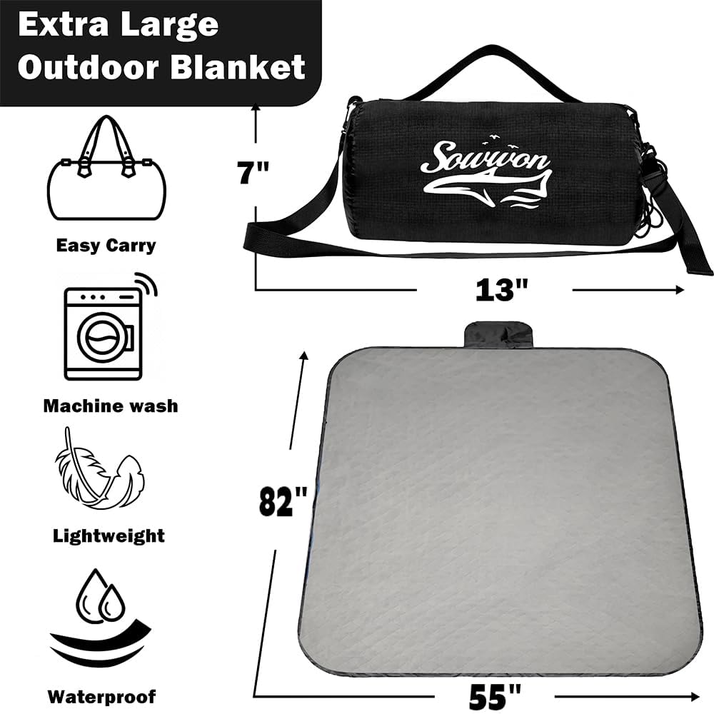 Waterproof Outdoor Blanket 82”X 55” Packable, Stadium Blankets for Camping with Quilted Fleece Lining, Large Windproof Emergency Throw Mat for Garss Picnic Hiking Road Trip, Machine Washable, Black