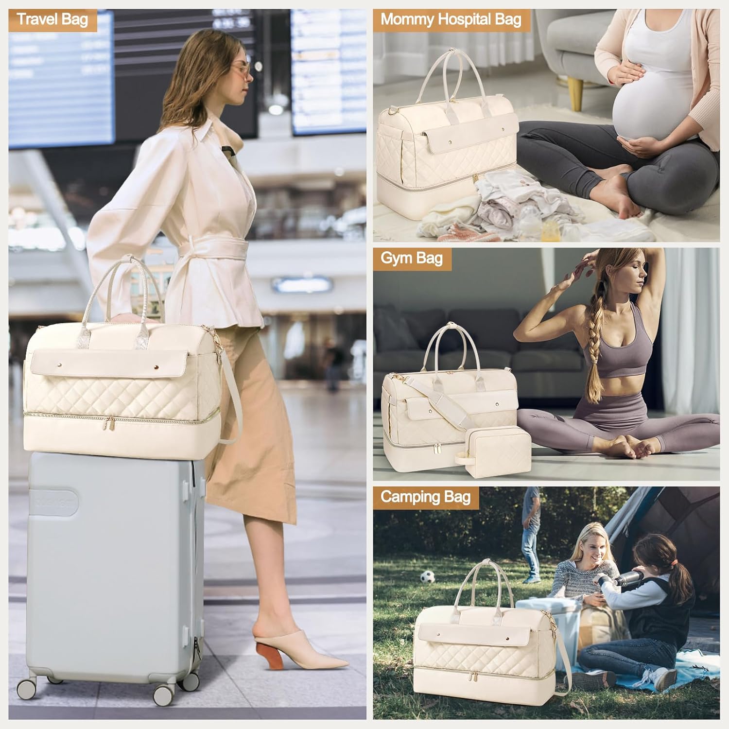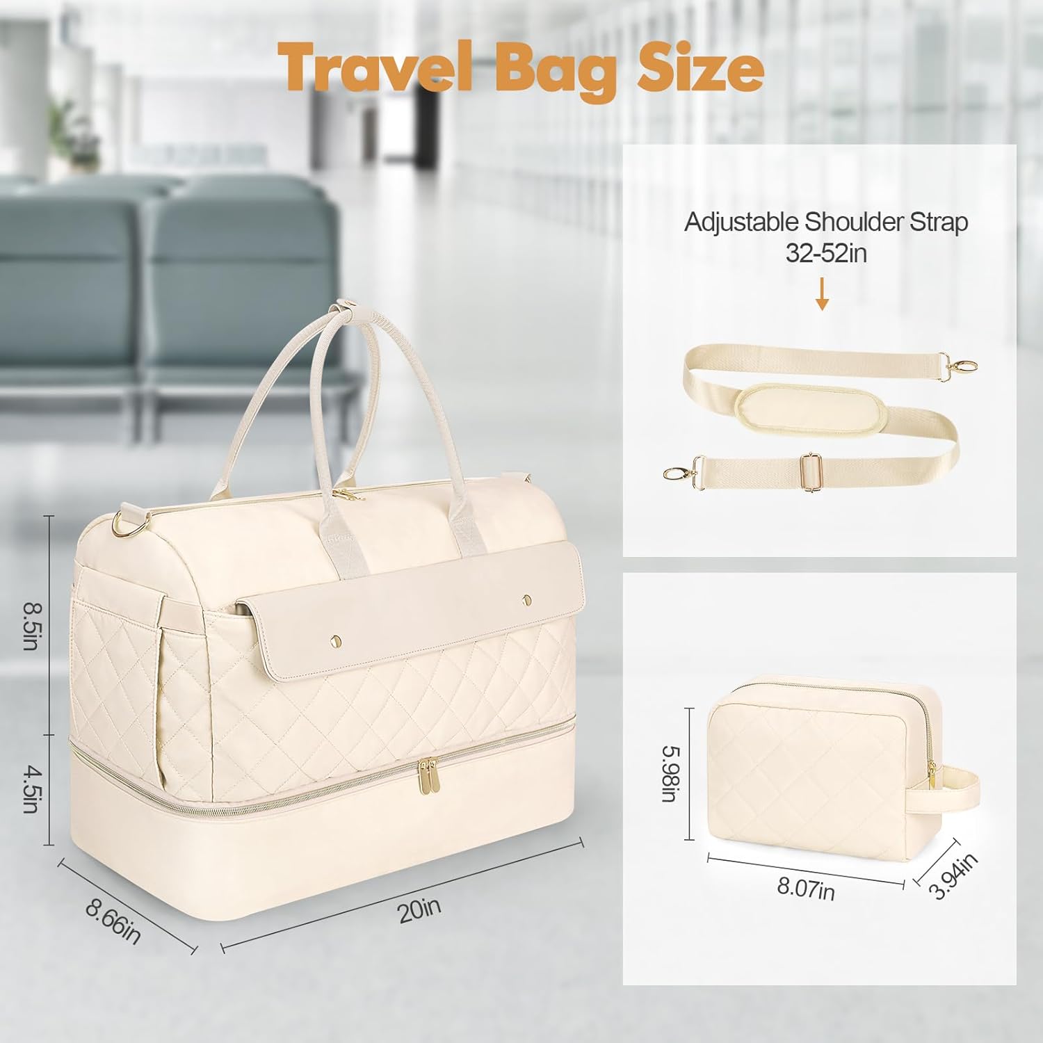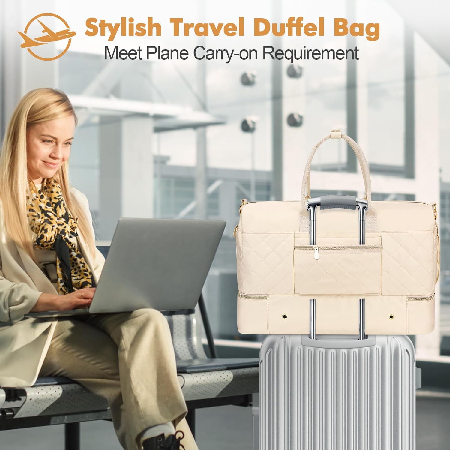 Wedama Travel Duffel Bag, Large Weekender Bag for Women with Shoe Compartment, Carry on Overnight Bag with Toiletry Makeup Bag, Gym Duffel Bag Travel Tote Bag for Travel Gym Camping Hospital, Beige