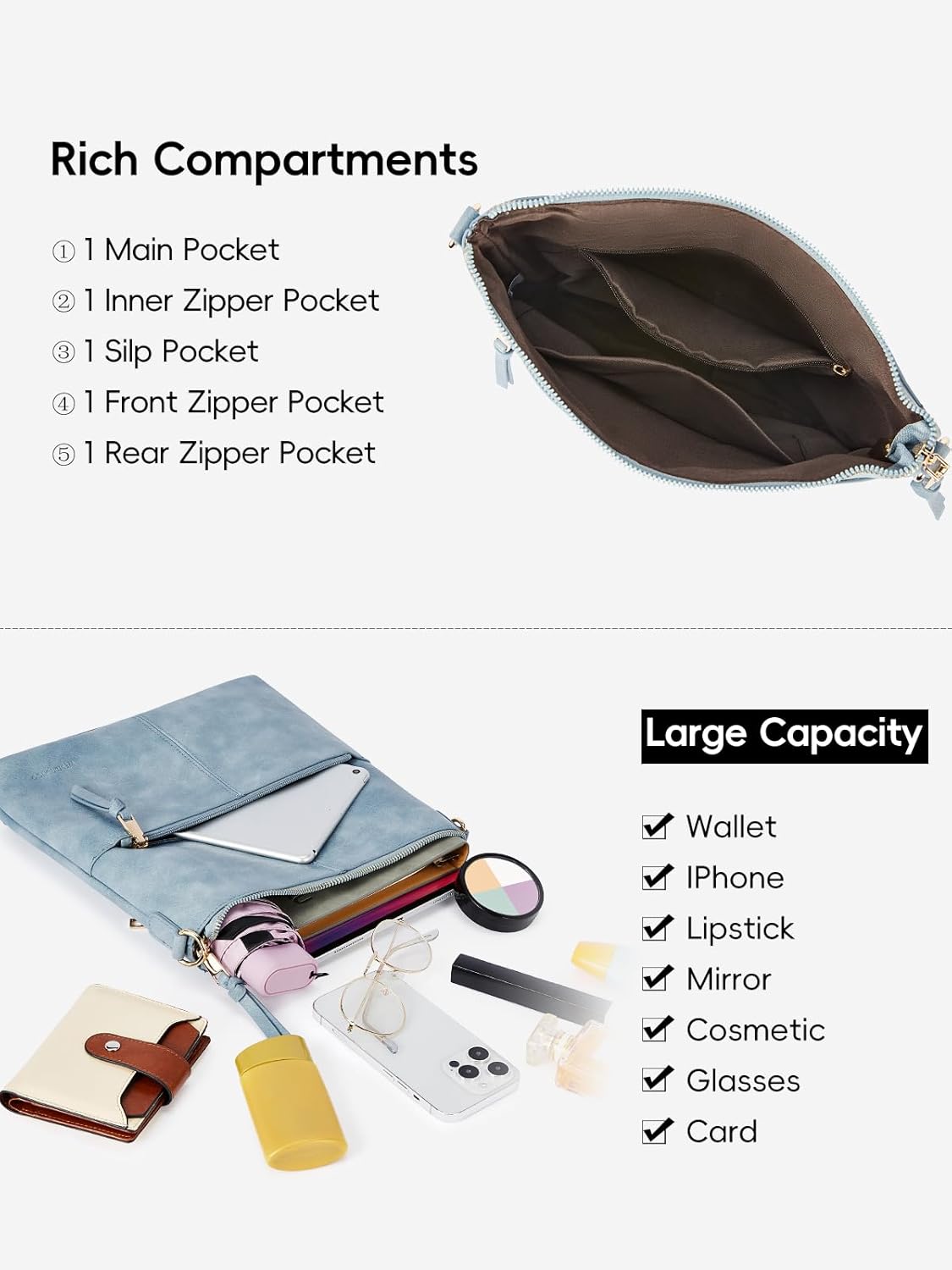 Considering functional and aesthetic aspects, the purse consists of 5 compartments, which can hold the items you need for daily travel. For example, you can choose different compartments to easily organize your wallet, phone, credit cards, makeup tools, mirror and more.