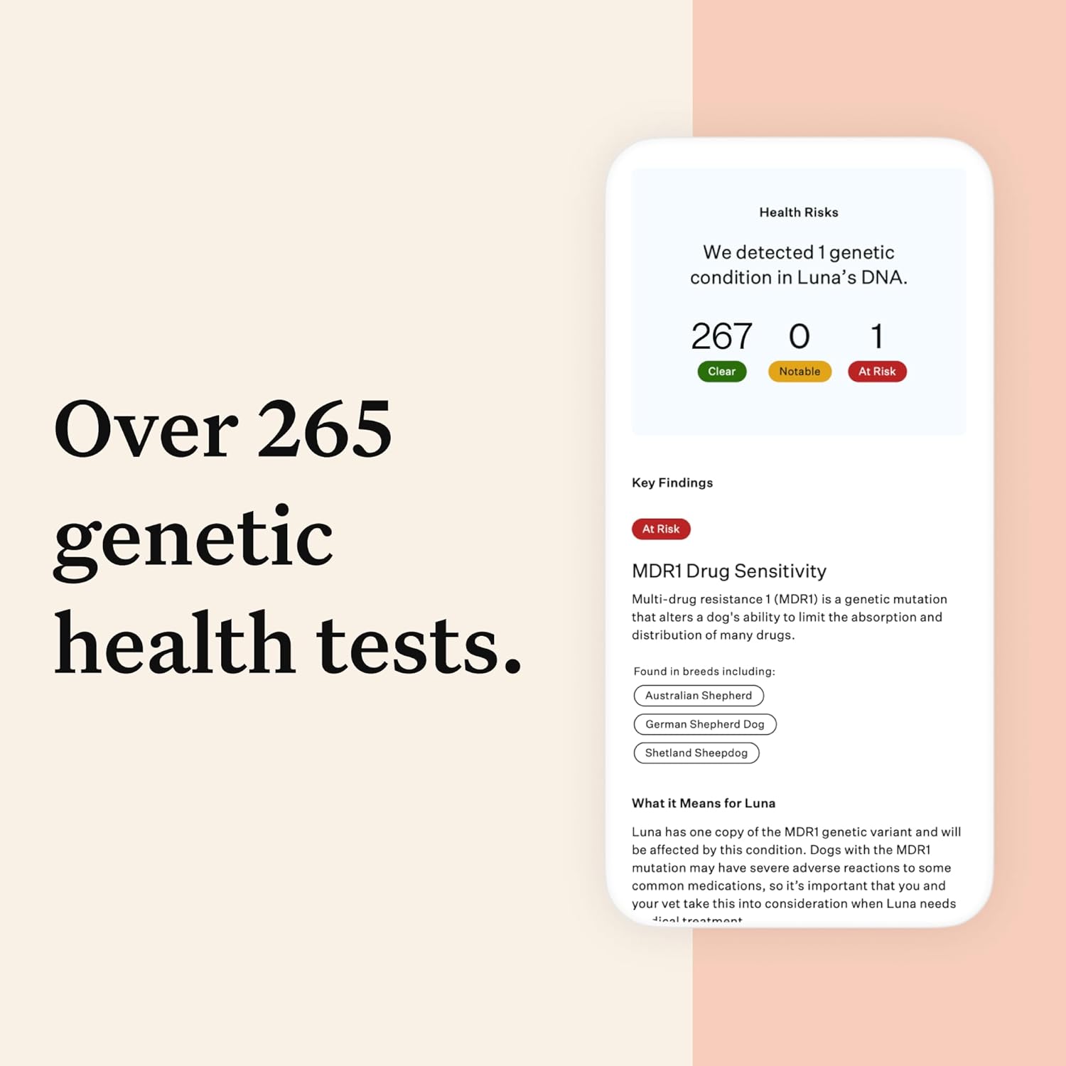 Screen For More Health Conditions Than Any Other DNA Test. We test for 265+ genetic health conditions (including MDR1, IVDD, POMC, and urinary stone risk) so you can get ahead of health risks and create a personalized care plan with your vet