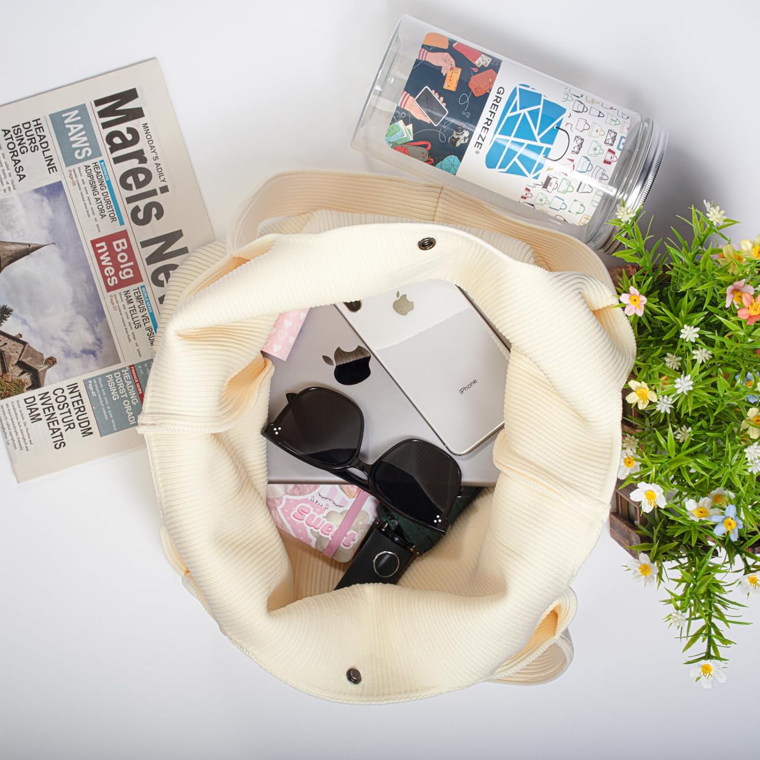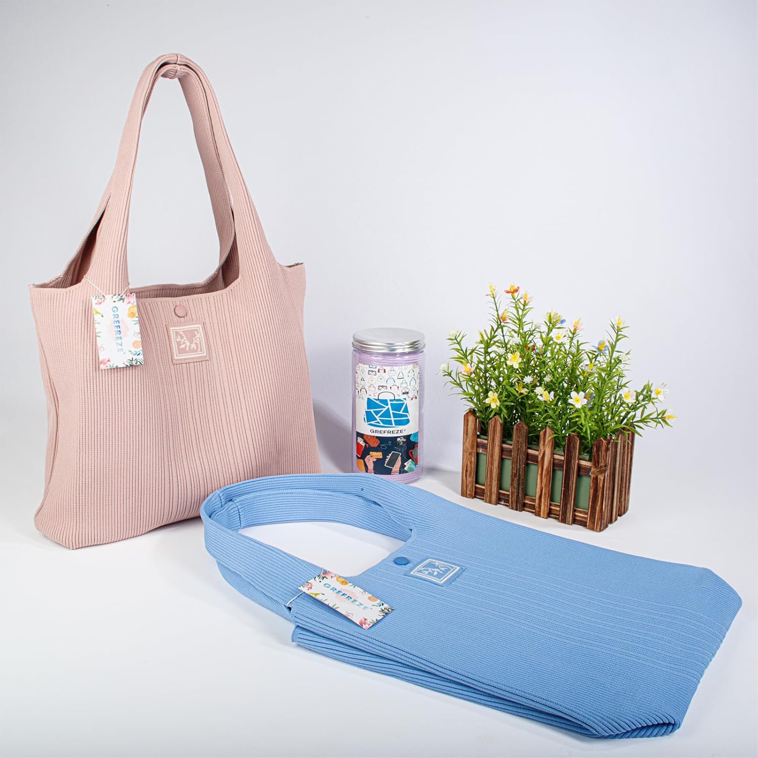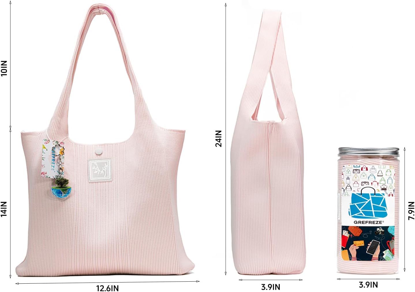 Fabric material:100% polyester.Lghtweight about 12 oz.The elegant emblem on the bag enhances its allure.The design of a seamless strap enhances the structural integrity of the bag.With a snap closure in the middle of the bagThe packaging is designed with reusable PET jars, which can serve as practical desktop storage for pencils.