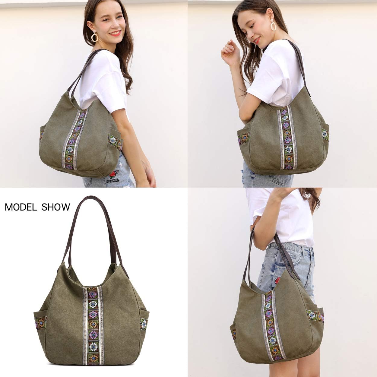 Worldlyda Women Canvas Hobo Purse Multi Pocket Tote Shopper Shoulder Bag Casual Top Handle handbag with Embroidery Ethnic