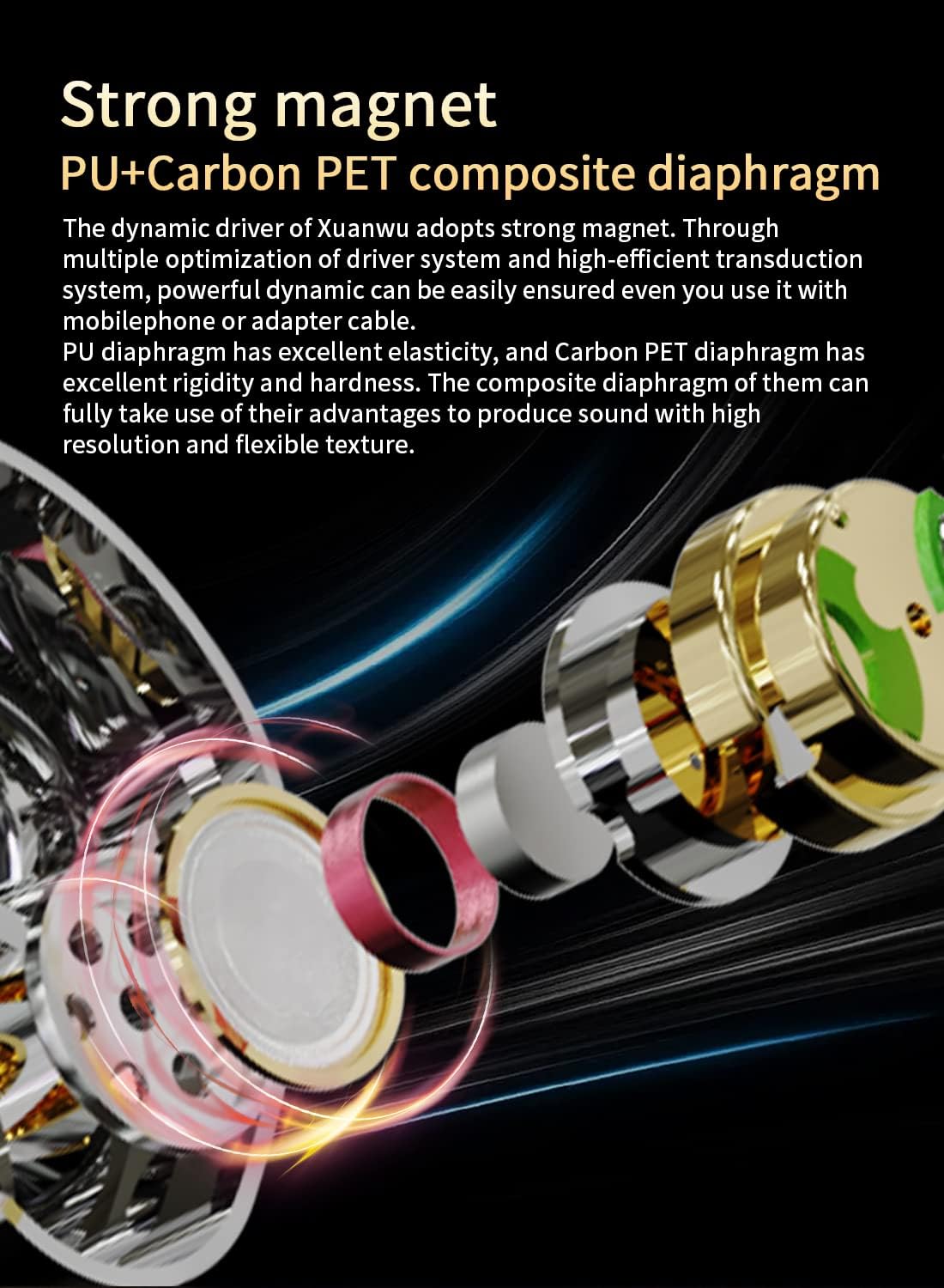 【8mm Dynamic Driver– Bright and Cohesive Timbre】 PU diaphragm has excellent elasticity, and Carbon PET diaphragm has excellent rigidity and hardness. The composite diaphragm of xuanwu in ear headphones can fully take use of their advantages to produce sound with high resolution and flexible texture. Powerful dynamic can be easily ensured even you use xuanwu iem with mobile phone or adapter cable.Bring you a new kind of sense.